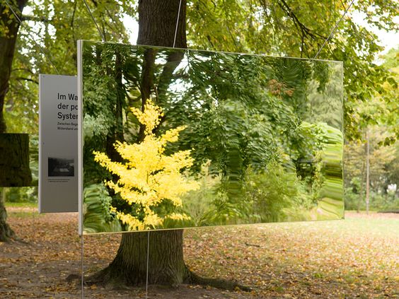 透明的鏡子標識,與森林形成一體的設計風